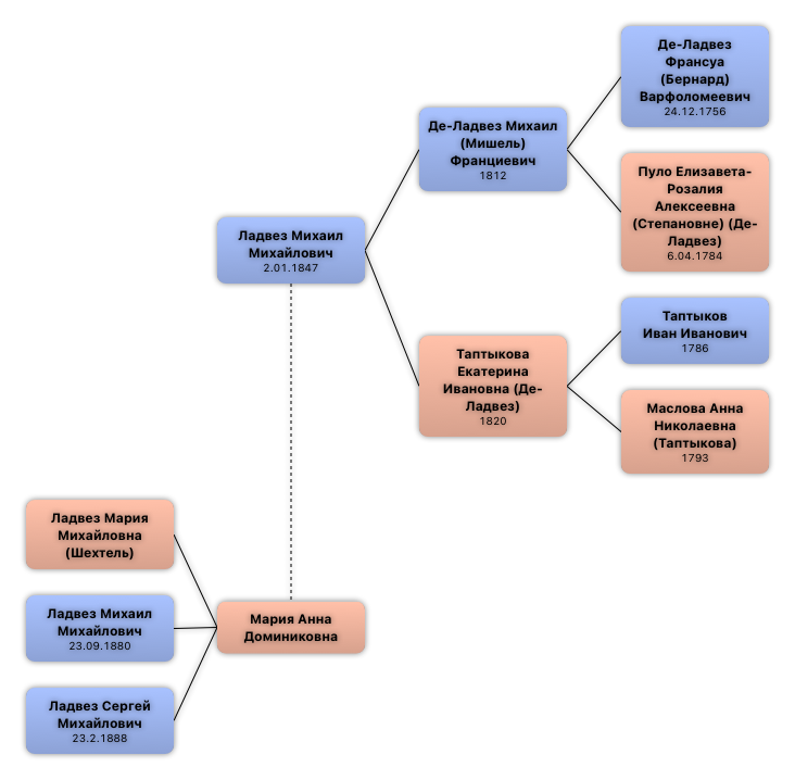 | Дворянский титул | 4.03.1854 | Указом от 4 марта 1854, данного Прав. Сенатом по Деп-ту Герольдии, было утверждено внесение во II ч. ДРК Москов. губ. титул сов. Михаила Михайловича Де-Ладвез, сына Михаила Фрацовича Де-Ладвез. | |